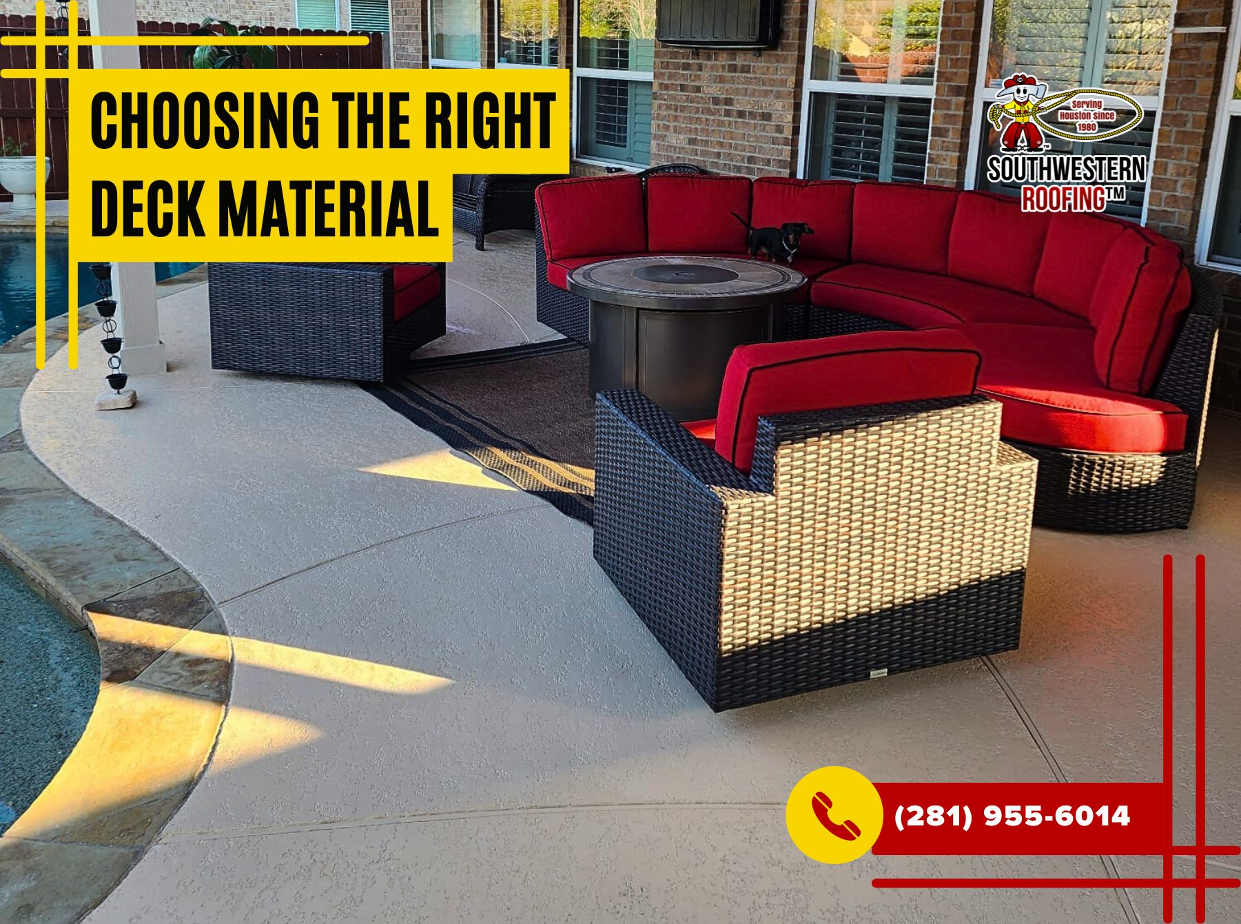 Whether you decide on wood or composite, having the right team for the job can make all the difference. At Southwestern Roofing, we specialize in high-quality deck installations that enhance both the beauty and functionality of your outdoor space. Our team will guide you through the selection process, ensuring you choose the best material for your needs while delivering expert craftsmanship and long-lasting results. Don’t leave your deck project to chance. Call Southwestern Roofing today at (281) 955-6014 for a consultation and let us help you create the perfect outdoor retreat for your home.