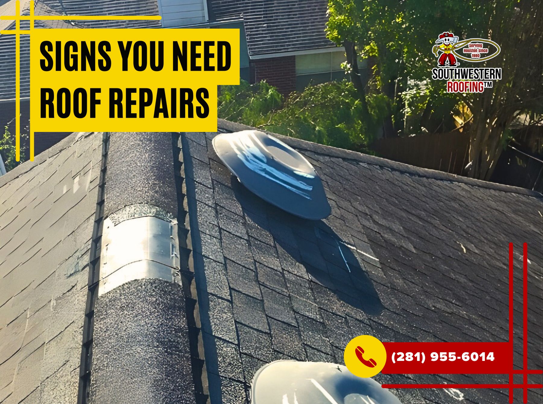 If you’ve noticed any of these warning signs or need a professional evaluation, don’t hesitate to reach out. At Southwestern Roofing, we specialize in roof repairs and inspections to ensure your home stays safe and secure. Call us today at (281) 955-6014 to schedule an appointment and keep your roof in top condition!